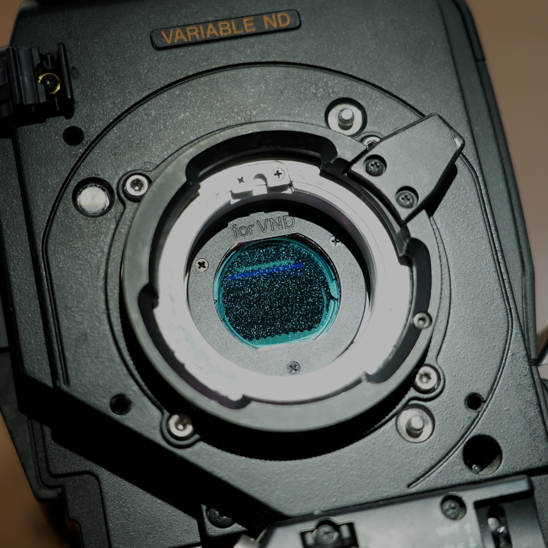 No, not dust on the filter, this a custom Tiffen ¼ Glimmer Glass filter fitted into the filter wheel of a Sony HDC-3500V. Top-Teks was asked to modify some cameras for one of our customers who didn’t want to have a bulky matte box on the lens of the system cameras being used handheld. The same can be done with other filter types, gives us a call if you have any requirements.